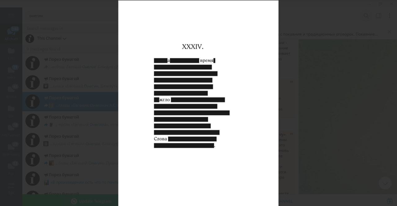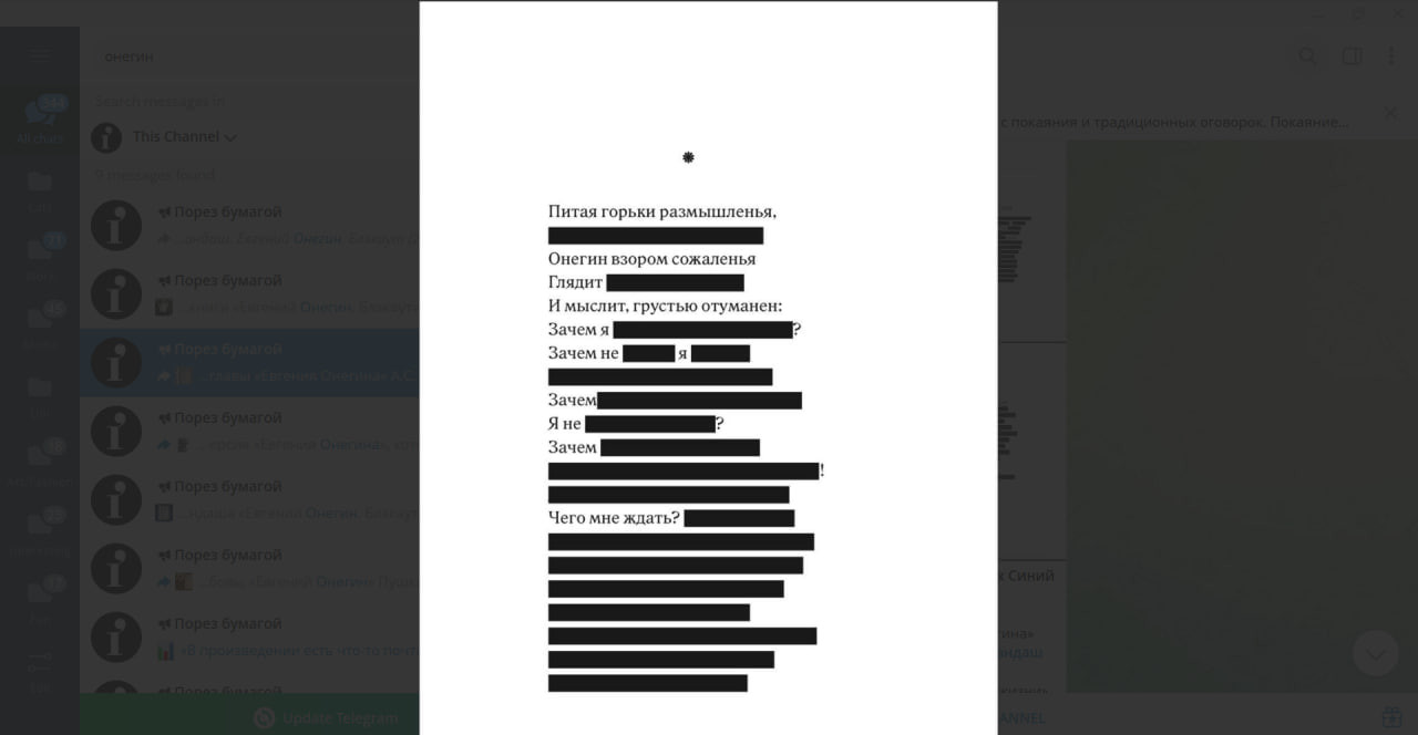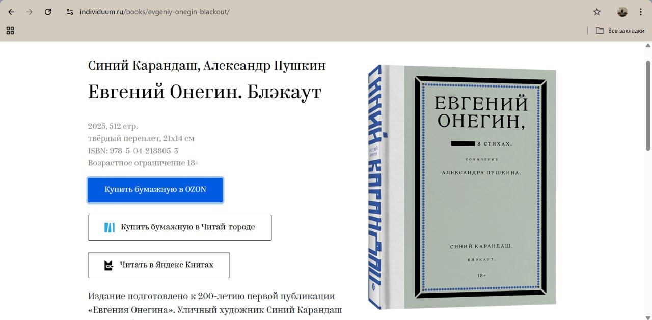 Корреспондент вспомнил, что недавно у издательства Individuum вышла возможная аллюзия на сложившуюся обстановку. Художник под именем Синий Карандаш черной краской "поправил" произведение Александра Сергеевича Пушкина. Стерев множество слов, он погрузил главных героев "Евгения Онегина" совершенно в иные обстоятельства и смыслы. Например, получился такой момент "Траги-неврически Евгений поклялся взбесить всех". Или более прямо: "А время жгло Слова". Сам Пушкин, кстати, в "Евгении Онегине" нарочно пропустил главу о Ленском.