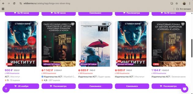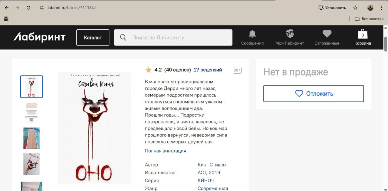 Роман "Оно" знаменитого автора ужасов Стивена Кинга исчез с маркетплейсов. Все потому, что мощное издательство АСТ получило запрос от Роскомнадзора. Вот тебе и пропажа. Формально считается, что дело в возрастном ограничении. В России раньше был выбор: книга или 16+, или уже для совершеннолетних. Однако в ней есть спорные моменты, и что с ними делать – пока что загадка. Может, и вовсе от них придется избавиться. Практика такая уже есть, в том числе и у АСТ.
