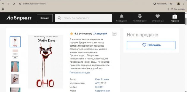 ТАСС сообщал, что "Оно" отсутствует на Wildberries, потому что может считаться запрещенным на территории России или по правилам самой площадки. Разберемся, что конкретно вызывает вопросы у цензоров. Сюжет книги строится вокруг борьбы подростков со сверхъестественным злом в образе отвратительного Клоуна. Методы у них специфические.