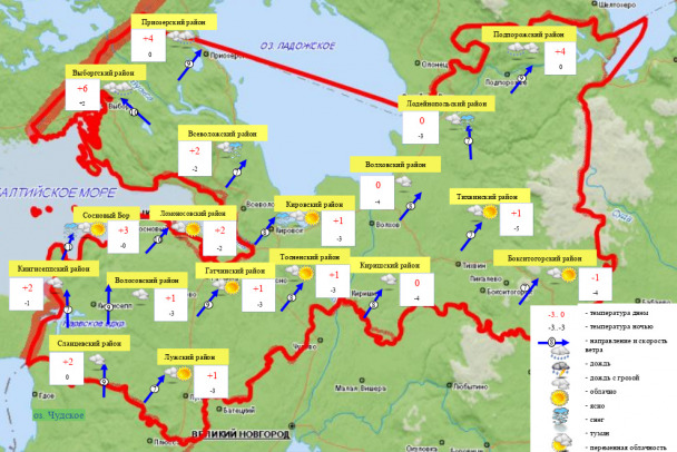 Ночью местами небольшой, днем в большинстве районов небольшой, местами умеренный снег, мокрый снег, на западе с дождём. В отдельных районах гололёд. Ветер юго-западный 7-12 м/с, ночью и утром в прибрежных районах местами порывы 15-17 м/с. На дорогах гололедица.