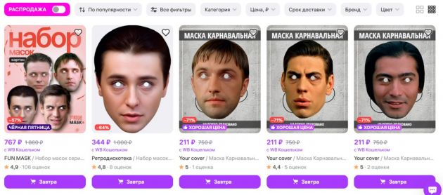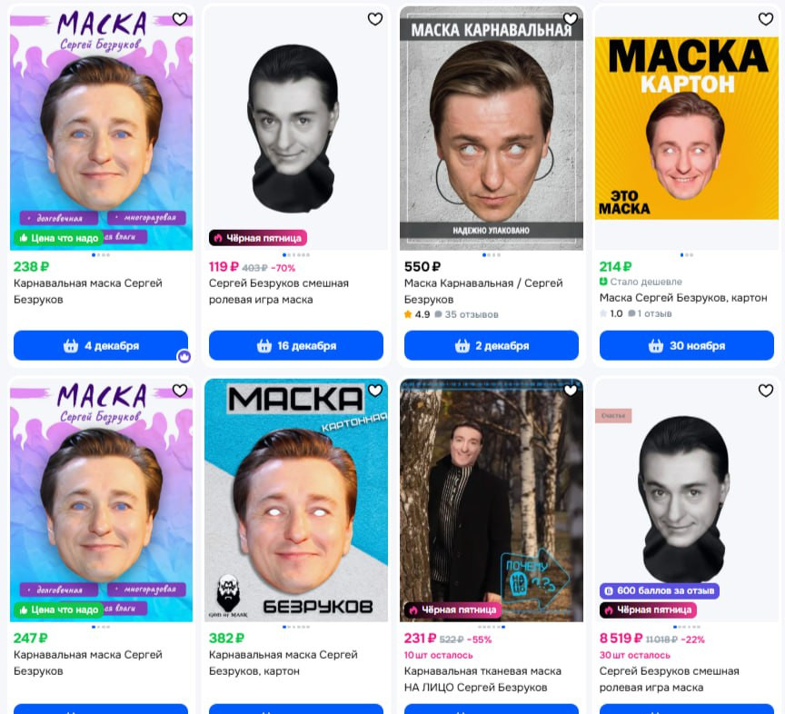 К слову, такая же участь постигла коллег Безрукова по сериалу "Бригада" – маски четверых персонажей-друзей предлагают прямо наборами. И других артистов, например, Стаса Михайлова, Михаила Галустяна, Ольгу Бузову, Диму Билана и др.