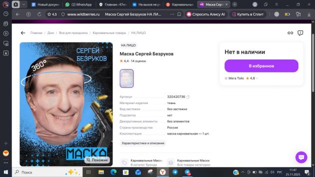 В документе говорится, что на маркетплейсах есть товары под названием "Карнавальные маски на лицо Сергей Безруков". Поскольку персональные данные используются без согласия, актер просит запретить распространение, а также взыскать компенсацию морального вреда.