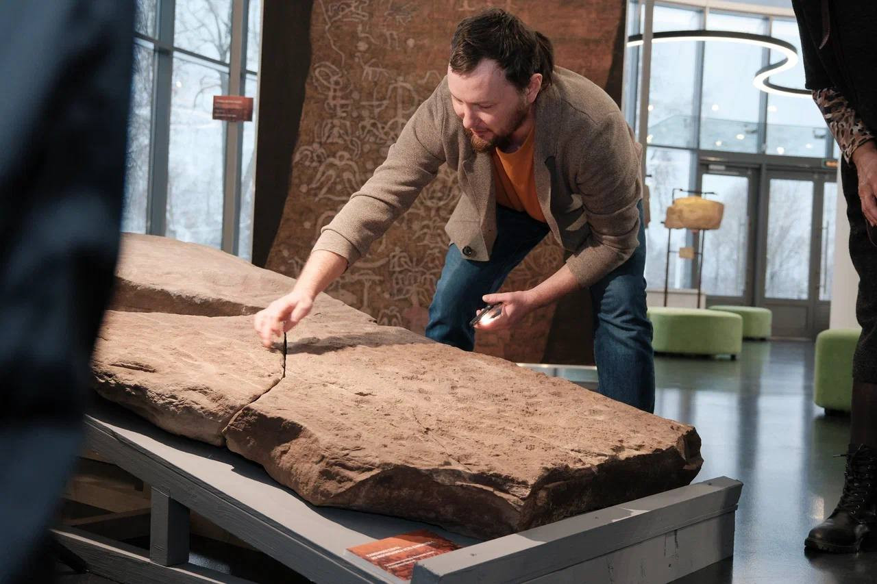 В Гатчинском округе Ленобласти открылась уникальная выставка в центре реставрации. Среди экспонатов – древняя плита из Хакасии с рисунками художников из разных эпох. Визитеры также могут увидеть настоящий скелет мамонта.