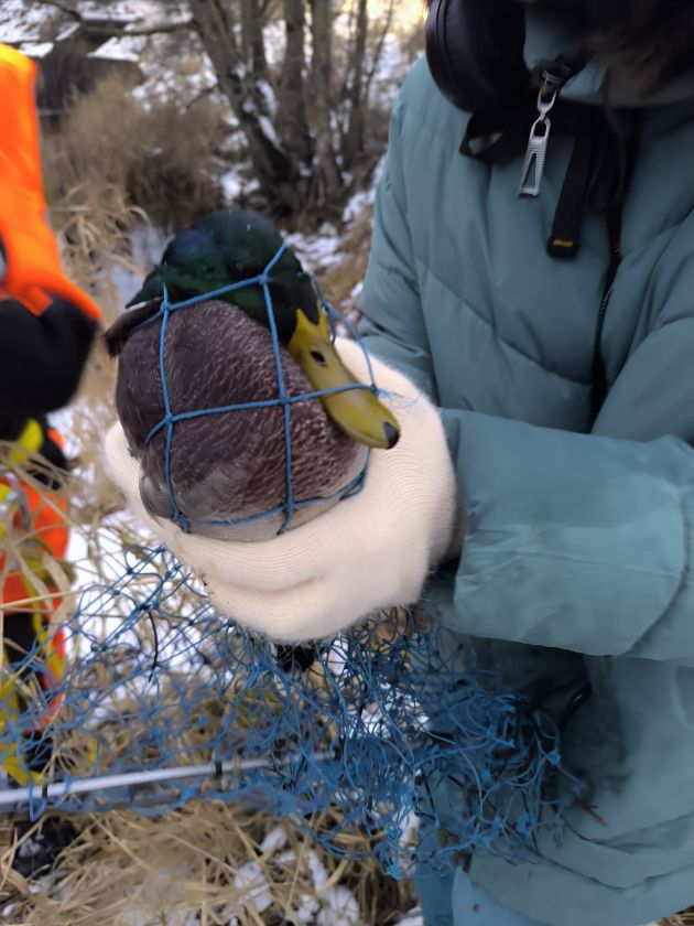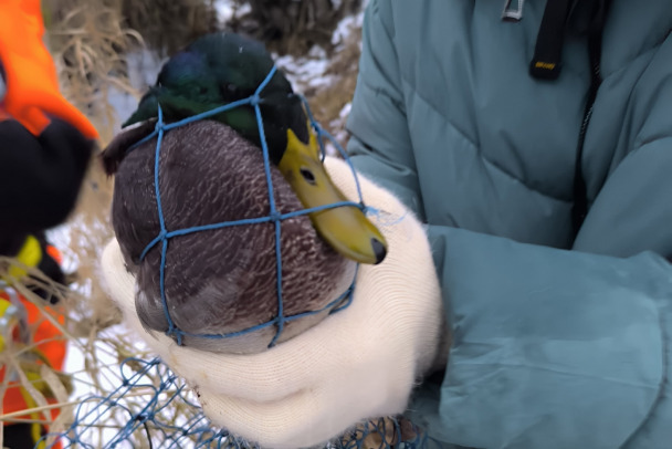 Сначала утка носилась по водоему, но в итоге выбилась из сил и потеряла бдительность. Пернатого накрыли сачком и вытащили из воды. Операция длилась около часа.