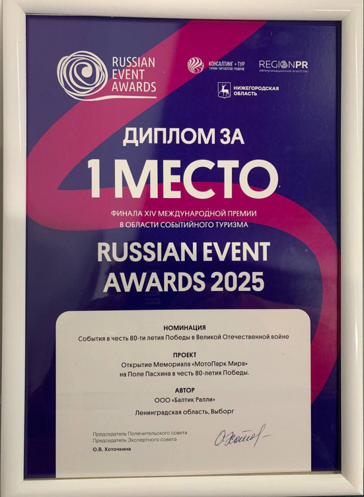 Как сообщает пресс-служба правительства Ленобласти 28 ноября, проект "Открытие мемориала "МотоПарк Мира" победил в номинации "События к 80-летию Победы" на международной премии Russian Event Awards.