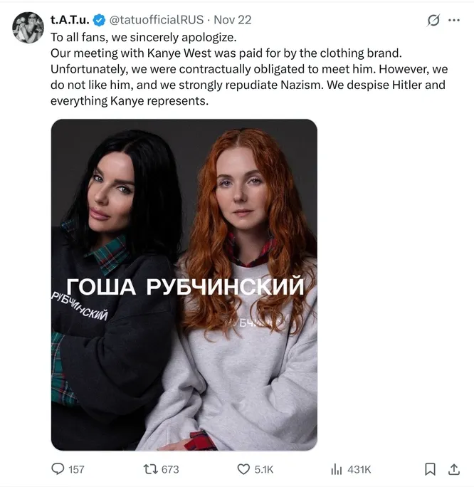 Фотография вышла в соцсетях без каких-либо уточнений – ни о каком сотрудничестве с рэпером "Тату" не заявляли. Впрочем, это не помешало возникновению некоторого общественного резонанса. В итоге в верифицированном профиле группы в соцсети X вышел пост с извинениями за фотографию. Впрочем, позже журналист Яна Чурикова в своем Telegram-канале передала, что "Тату" за Канье не извинялись. И вообще тот аккаунт – фанатский. Позже он и вовсе был то ли удален, то ли архивирован. Поклонники писали, что таинственный профиль с "галочкой" и раньше исчезал из медиапространства.