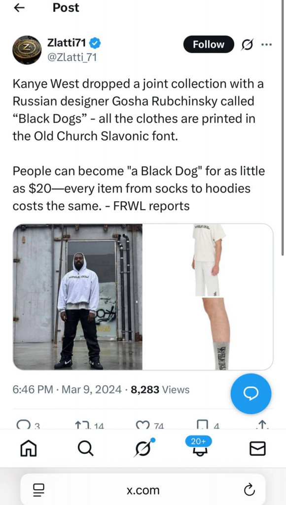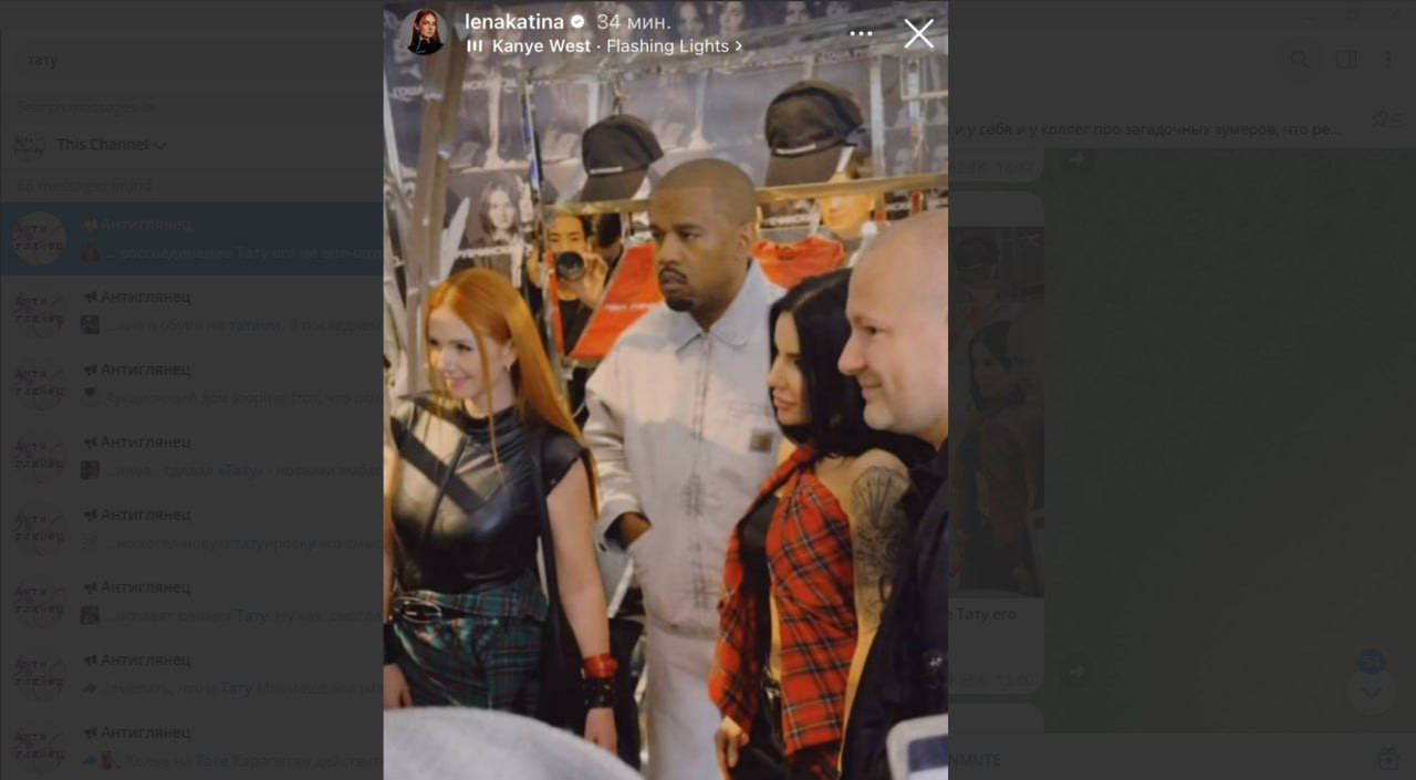 Кстати, сам Уэст публично появлялся в футболках, разработанных Рубчинским. Например, с надписью "Черные псы". Несмотря на то, что русский дизайнер прекратил сотрудничество с рэпером и его брендом Yeezy еще в начале 2025 года, видимо, они продолжают дружить. Иначе никак не объяснишь то, что он появился и на той самой скандальной фотографии с Леной Катиной и Юлией Волковой.