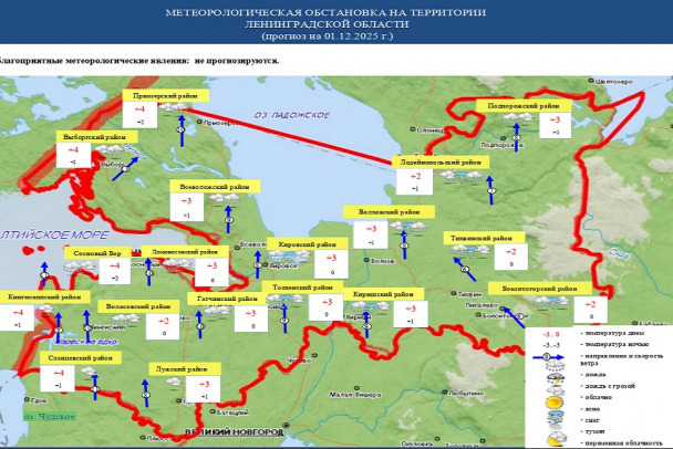 В понедельник, 1 декабря, в 47-м регионе будет плюсовая температура воздуха, а на дорогах – гололедица, политая дождем. Прогноз погоды от ФГБУ "Северо-Западное УГМС" на начало недели и первого зимнего месяца опубликовала пресс-служба ГУ МЧС России по Ленобласти.