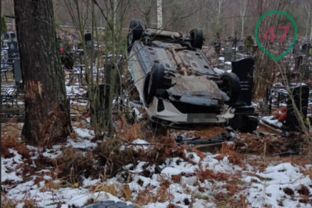 Как сообщал 47news, в воскресенье около 02:00 в районе поселка Мга арендованная Geely Cityray не просто съехала с дороги в сторону кладбища, она в полете перевернулась на крышу и приземлилась среди могил. На место выезжали спасатели и скорая, помощь медиков никому не потребовалась. Машина оставалась лежать так до утра.