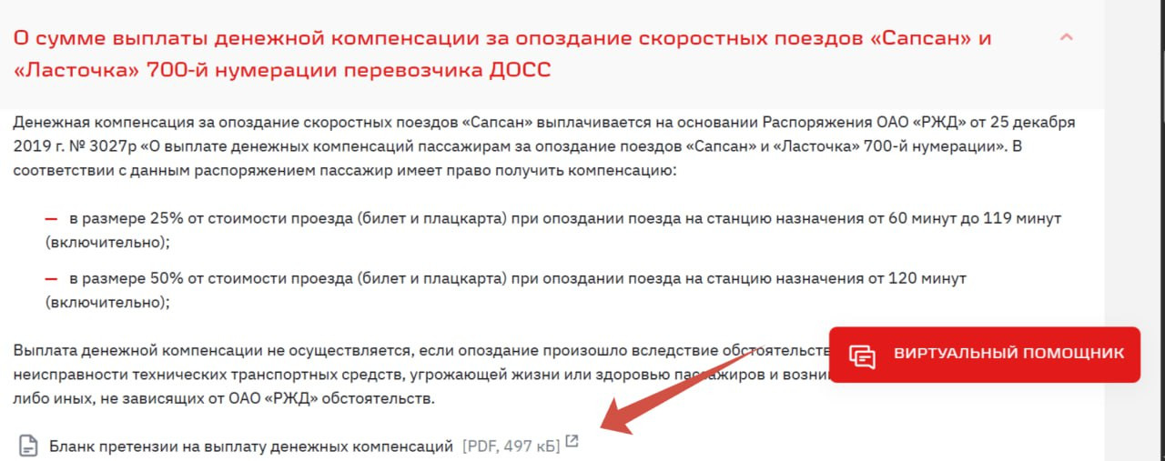 Для этого нужно заполнить бланк претензии на выплату денежных компенсаций на сайте РЖД. Его можно найти в разделе "Пассажирам", в подразделе "Часто задаваемые вопросы", выбрав "О сумме выплаты денежной компенсации за опоздание скоростных поездов "Сапсан" и "Ласточка" 700-й нумерации перевозчика ДОСС".