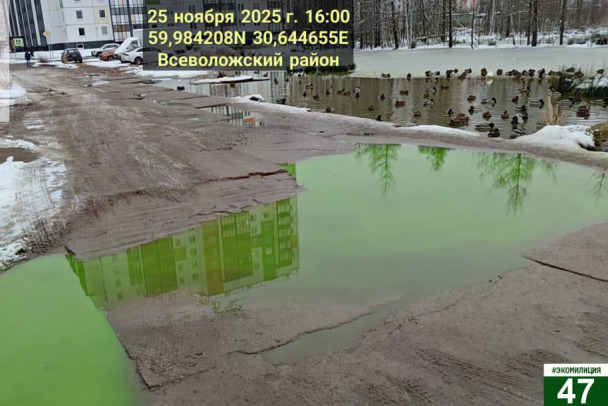 Ранее 47news сообщал, что жители Всеволожска пожаловались на ярко-зеленый цвет воды на Севастопольской улице. По их словам, на месте разлива живут утки – это видно по фотографиям. Кроме того, рядом находится продуктовый магазин. Госэконадзор 25 ноября проверил обстановку. Предполагается, что водоем приобрел неестественный оттенок из-за пищевого красителя.