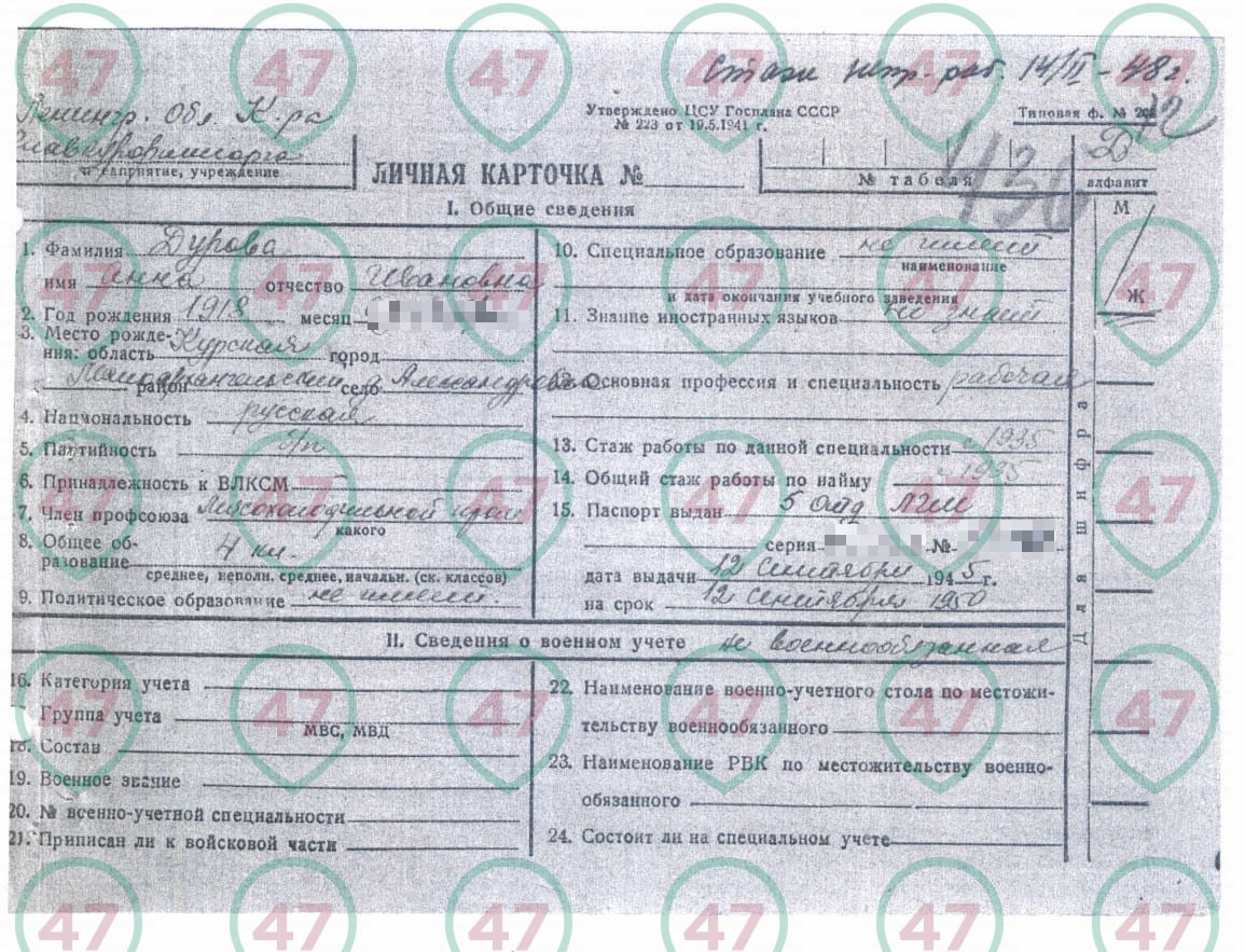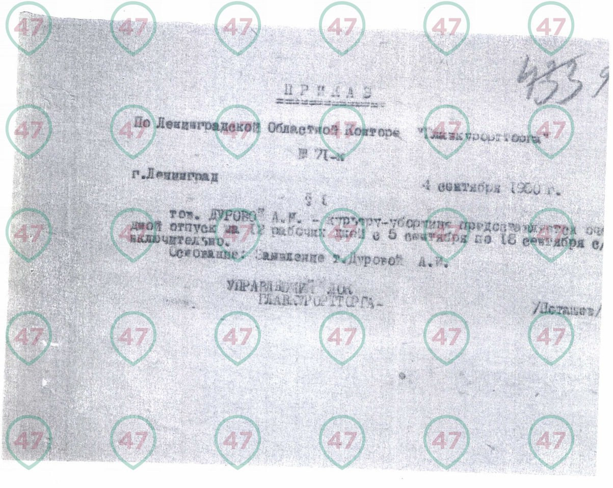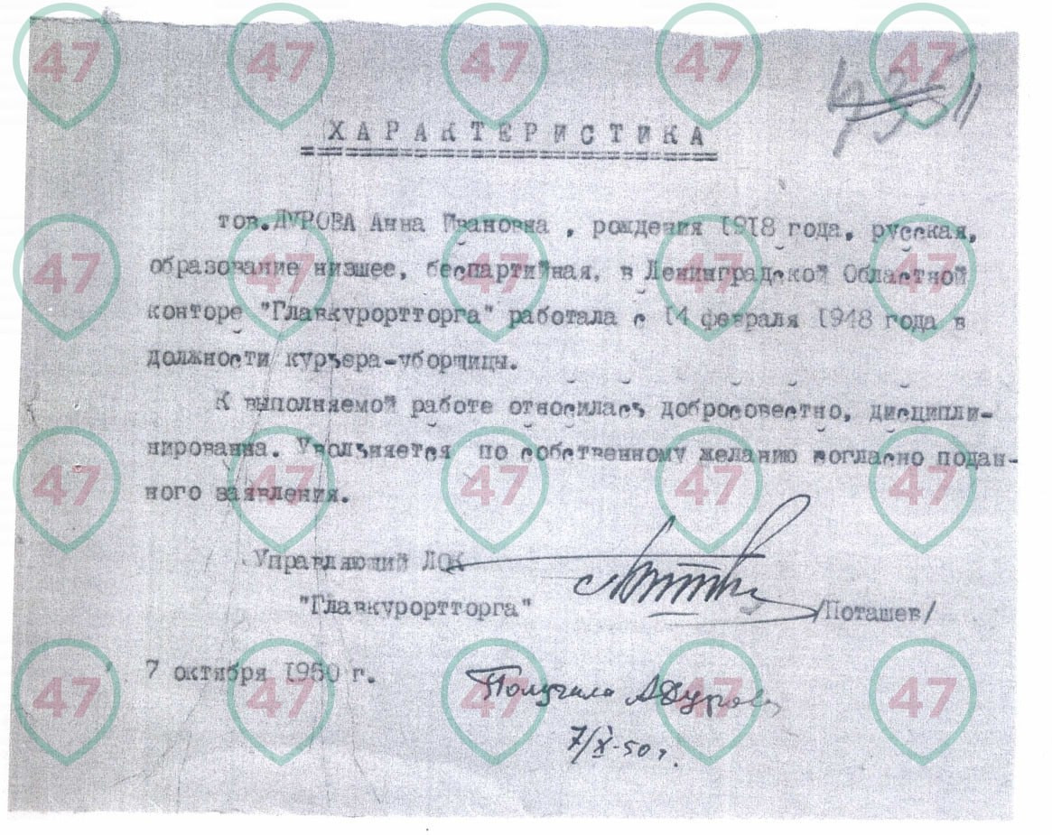 Вот на вас из 1948 года смотрит кандидат в "специалисты по доставке и клинингу" 30-летняя Анна Ивановна Дурова. Она уже 16 лет как в большом городе, у неё двое детей в коммуналке, медаль за оборону Ленинграда, и она уже разведена. Анна устраивается в ленинградскую контору Главкурортторга. Эта организация-филиал занималась снабжением населения и закрытых учреждений промтоварами и продовольствием. В современных реалиях это был бы небольшой региональный подвед в структуре Минпромторга.