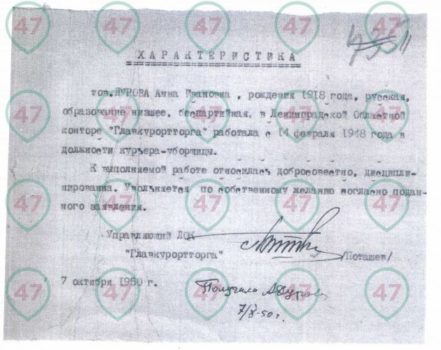 Проработала в конторе Ленкурортторга Анна Дурова не долго — всего два года. Уволилась по собственному желанию, а курьером, судя по всему, была достойным. "К выполняемой работе относилась добросовестно, дисциплинированна", - найдёт для неё слова в характеристике управляющий товарищ Поташев. Есть поощрения. Накануне Международного женского дня Анну наградят почётной грамотой за всё тот же добросовестный труд.
