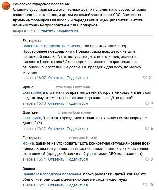 Жителей города Кудрово серьезно раззадорила информация о методе распределения подарков на Новый год детям. От муниципалитета сладкие презенты получат только те младшеклассники, кто закончил четверть на "отлично", и те, кто относится к семье участника СВО. Такое распределение вызвало бурю негодования, особенно среди родителей, которые в своём детстве ходили на школьные ёлки без оглядки на оценки и подвиги отцов.