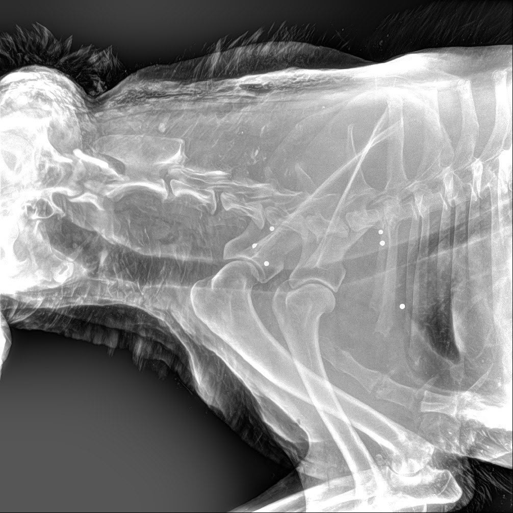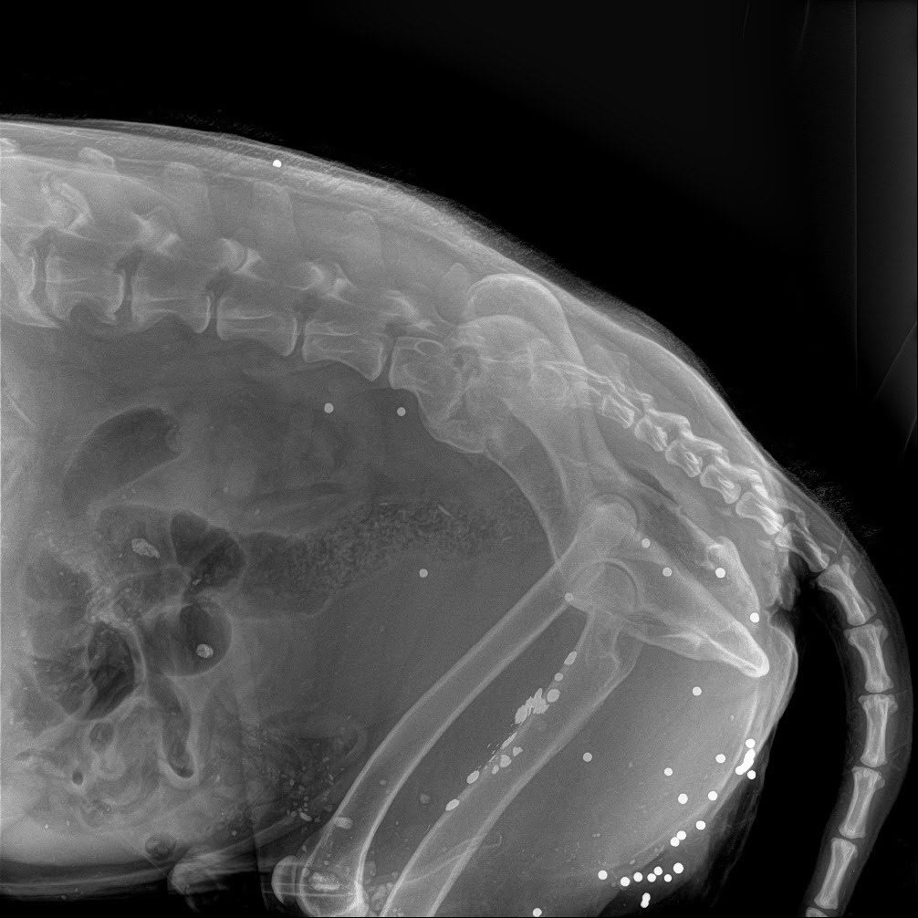Животное доставили в ветклинику в Красное Село. Как рассказал 47news директор фонда Сергей Лучинский, при обследовании выяснилось, что в собаку стреляли. Рентген показал больше 30 шариков, крайне похожих на ружейную дробь. Раны есть даже на голове. Кроме того, волонтеры предполагают, что собаку мог сбить автомобиль.