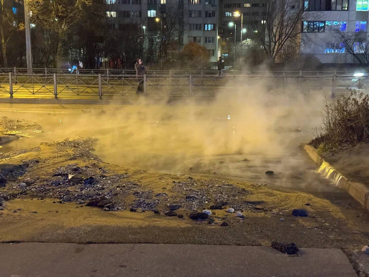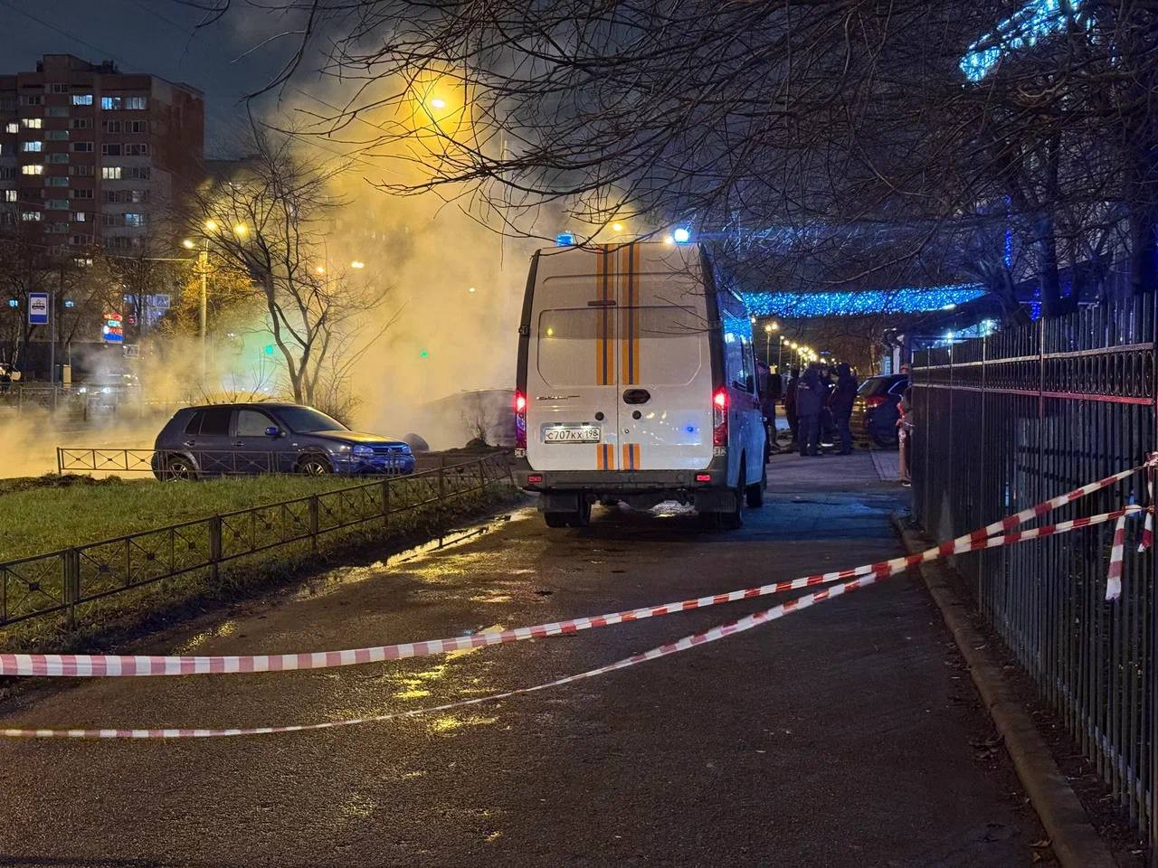 Горячая вода хлынула на землю в Кировском районе Петербурга. Одному человеку потребовалась помощь медиков. Пострадали и машины.