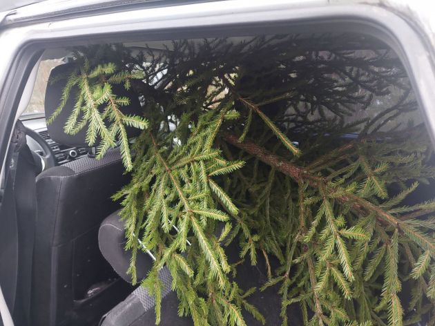Здесь в итоге пилю ту, что ближе к дороге. Тонкий ствол поддается почти без усилий, елка без труда умещается в мою небольшую машину.