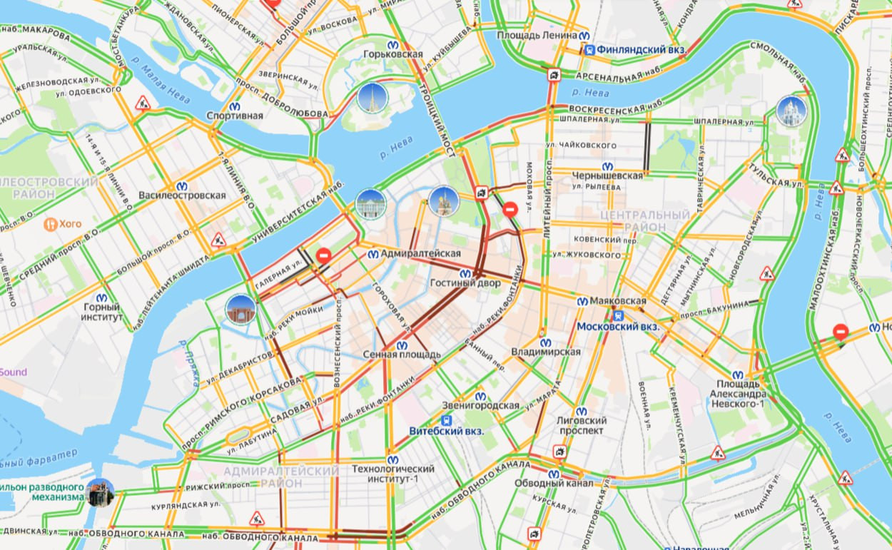 Согласно сервису Яндекс.Пробки в 15 часов 21 сегодня уже стоит центр Петербурга. Бардовым цветом окрашены Невский проспект, набережная Фонтанки и район Адмиралтейства.