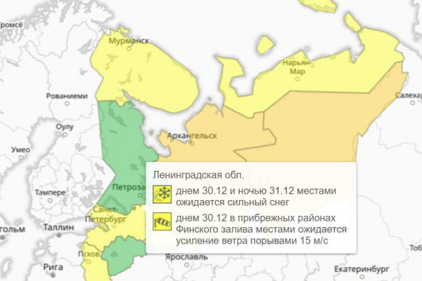 Кроме того, до 21 часа 30 декабря в 47-м регионе сохраняется предупреждение о сильном ветре. Местами по берегам Финского залива порывы будут достигать до 15 метров в секунду.
