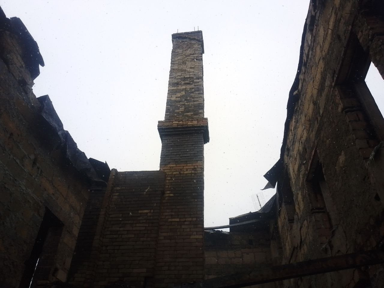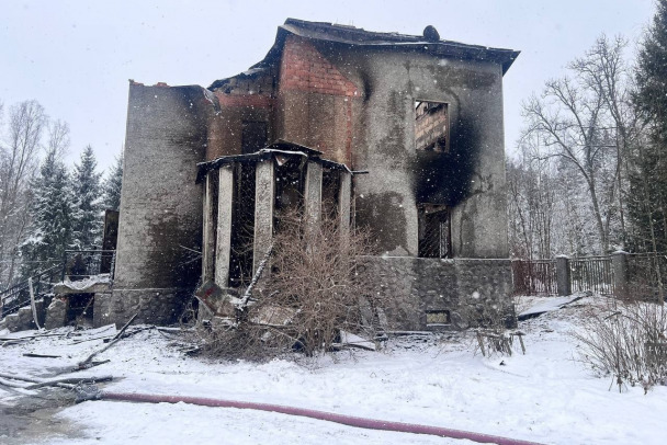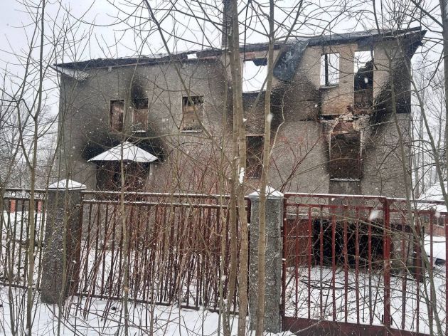 На фотографиях двухэтажное здание с колоннами у входа выглядит полузаброшенным. Стекла окон выбиты, крыша полностью отсутствует.