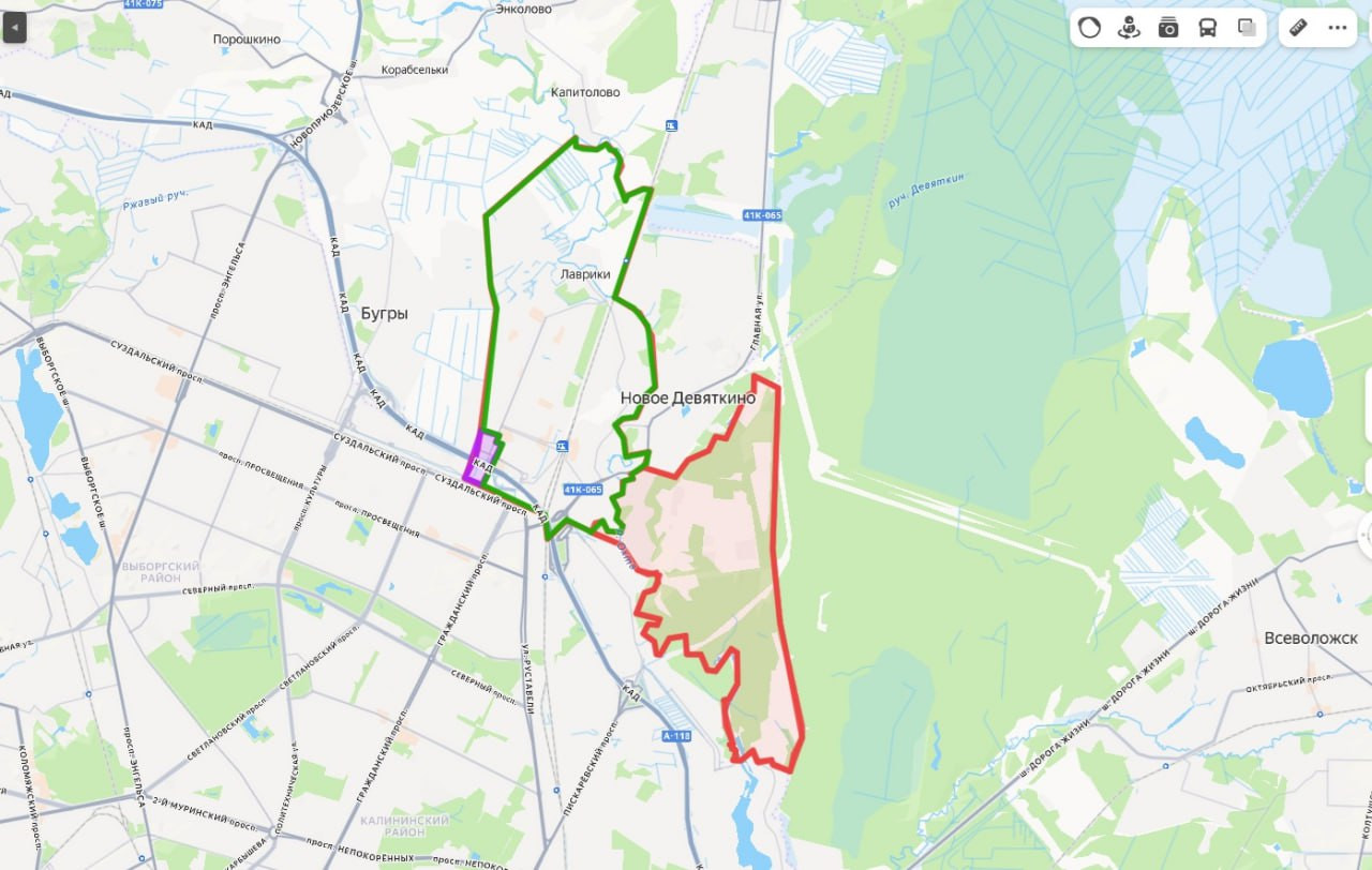 printscreen 47news/ зеленым выделена часть Мурино, относящаяся к Муринскому округу, красным - ко Всеволожскому, фиолетовым - к Бугровскому