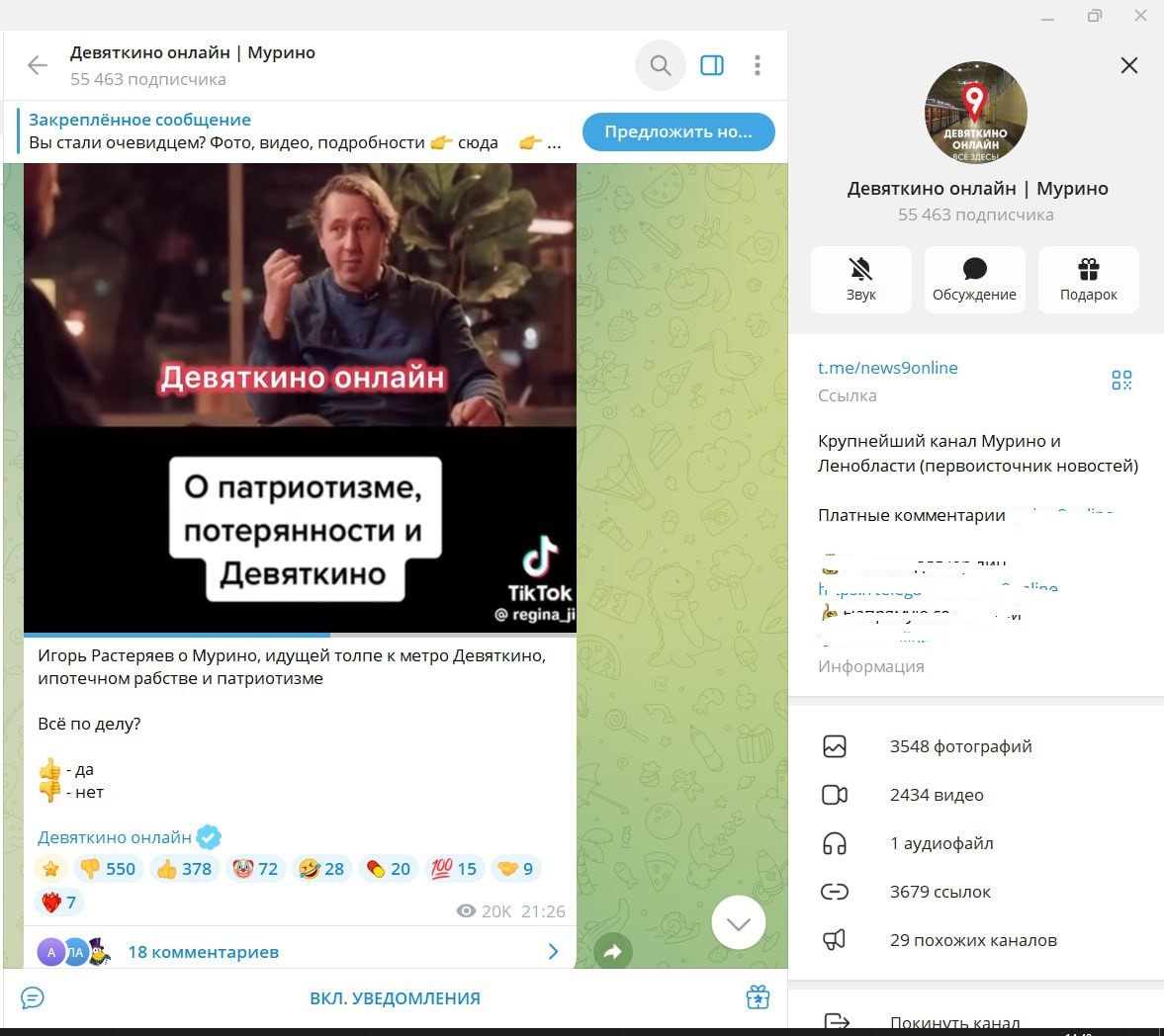 Отрывок того самого интервью журналиста Николая Солодникова с Игорем Растеряевым опубликовали в Telegram-канале "Девяткино онлайн | Мурино" вечером 14 января. За это время он набрал свыше 1000 разных реакций и почти 20 тысяч просмотров.