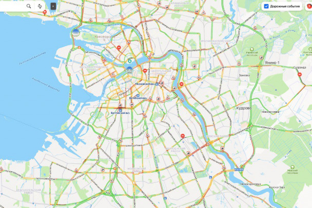 Центр Петербурга окрасился в красно-желтые цвета на карте пробок этим вечером. По кольцевой тоже не везде можно проскочить.