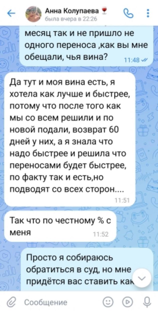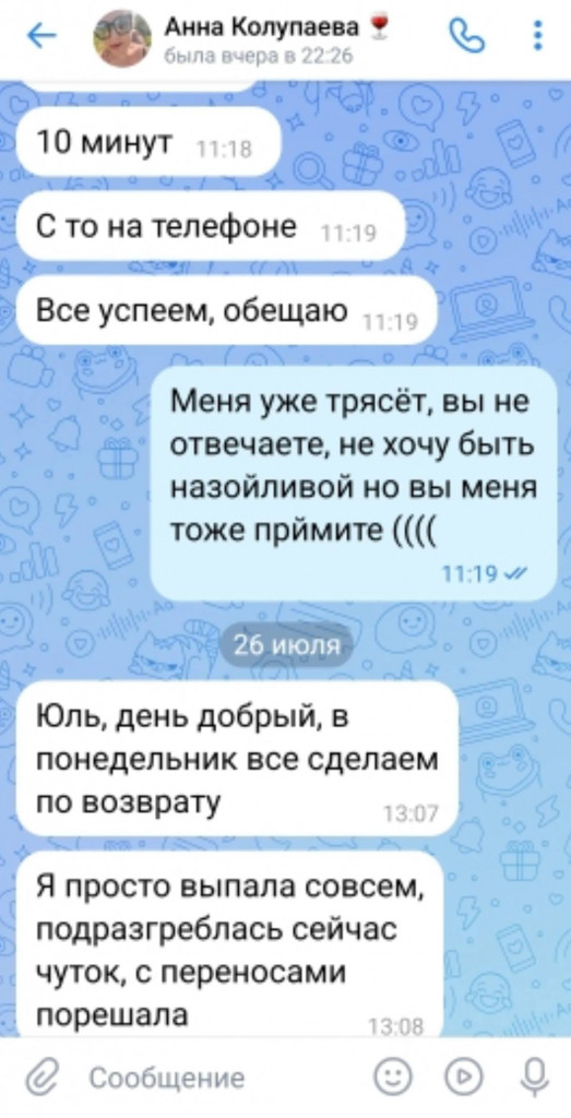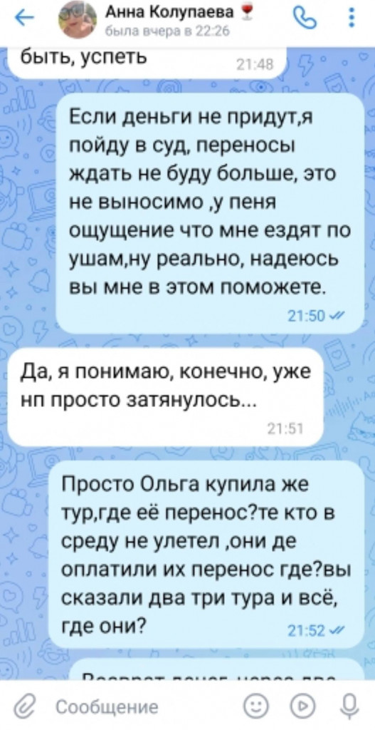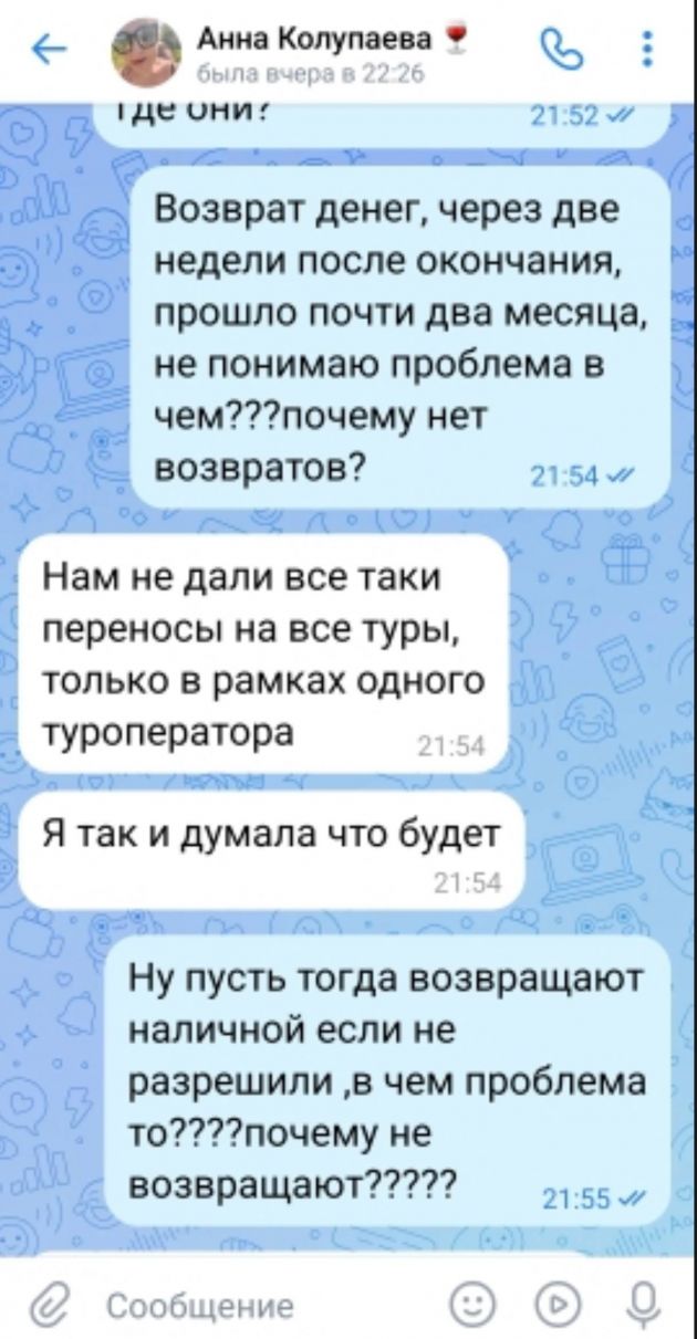 "От Анны были только положительные эмоции: всегда на связи, очень приветлива, знала нашу семью. На апрель 2025 года купили тур в Шарм-эш-Шейх, должны были вылететь 10-го, 9-го вечером звонок: "Рейс не дают, надо ждать". Ждем день-два, 12-го ни документов, ни билетов... В итоге 13-го документы нам передавали прямо в последней электричке с Сиверской в Петербург", – восстановила хронологию Ольга. По такому же сценарию развивалась поездка в сентябре в Турцию за 147 тысяч: но улететь в Анталью так и не получилось, а деньги не вернули.