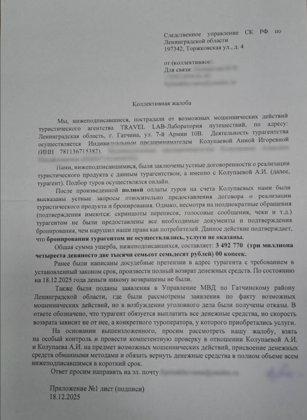 Претензии возникли к основательнице Travel Lab (другое название – "Лаборатория путешествий"), предпринимательнице Анне Колупаевой. Ее данные указаны на странице турагентства в соцсети. По данным информационной системы "СПАРК", ИП зарегистрировано в поселке Тайцы в 2019 году, основный вид деятельности – туристические агентства. На платформе сообщается, что есть решения ФНС о приостановлении операций по счетам.
