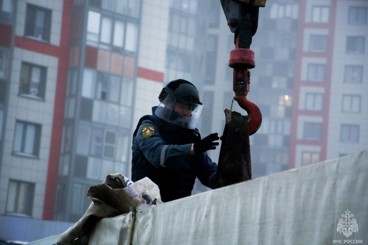 С помощью спецтехники боеприпас извлекли из земли и вывезли для уничтожения на спецполигон. Уже на площадке прогремел взрыв, который также попал на камеру.
