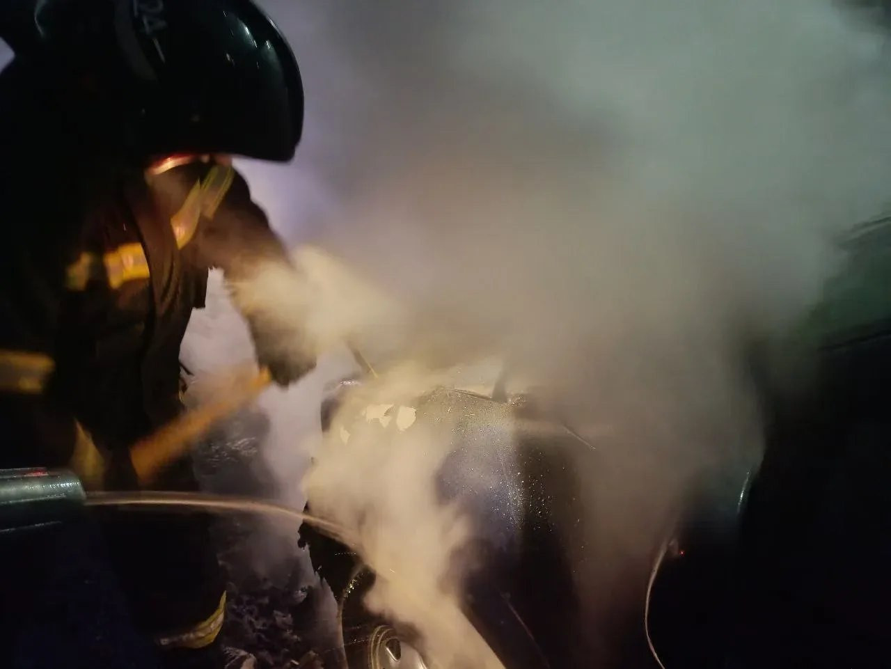 На кадрах с места видно дым и сотрудника в защитной одежде. Судя по фото, у машины оказалось частично оплавлено покрытие. Обстоятельства уточняются.