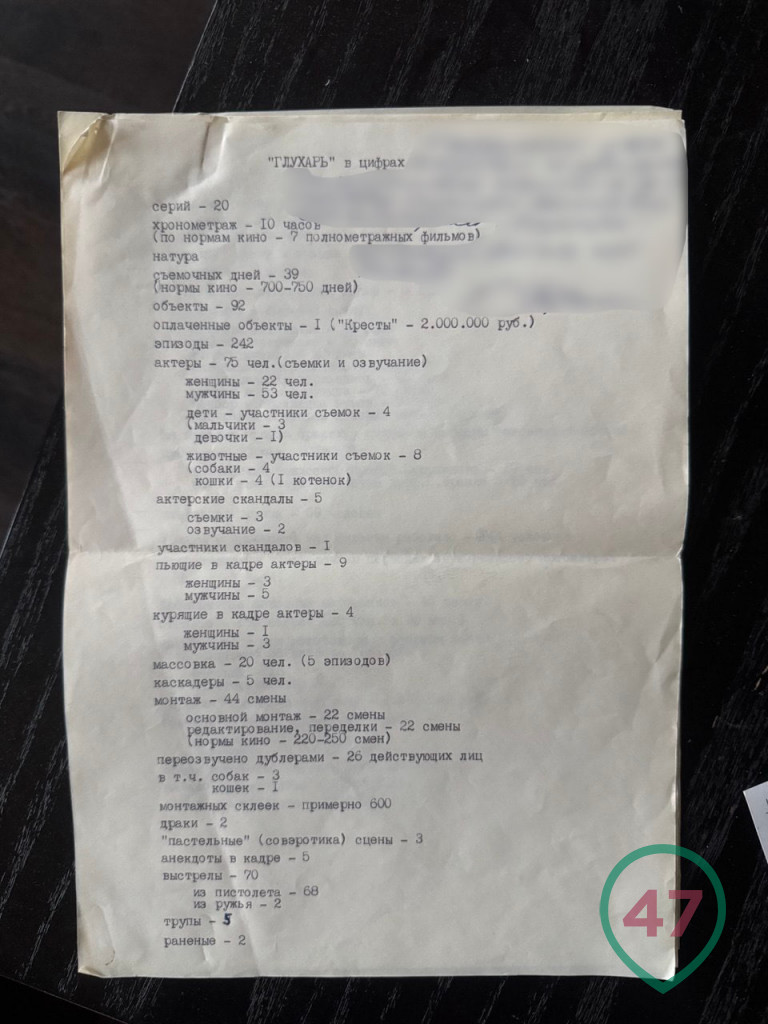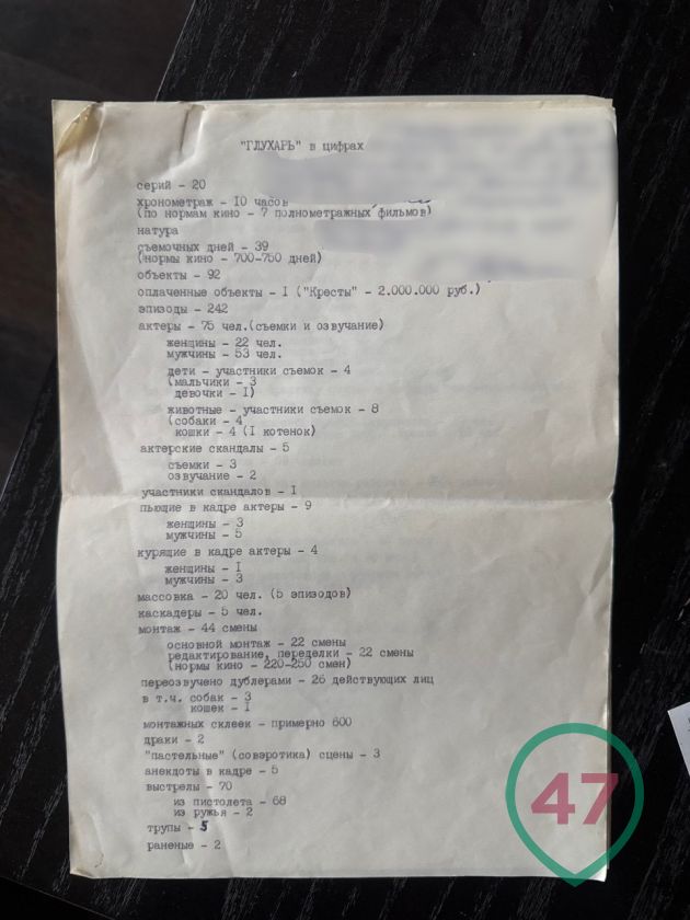 У 47news есть редкая смета. В киноцифрах "Глухарь" - 10 часов видеоматериала, то есть семь полноценных художественных фильмов или 26 кассет "Бетакам". Снимали с августа 1993-го до сентября 1994-го 242 эпизода. В том числе две драки, три постельные сцены, произвели 70 выстрелов (68 из пистолета, два из ружья). Пять раз в кадре травили анекдоты.