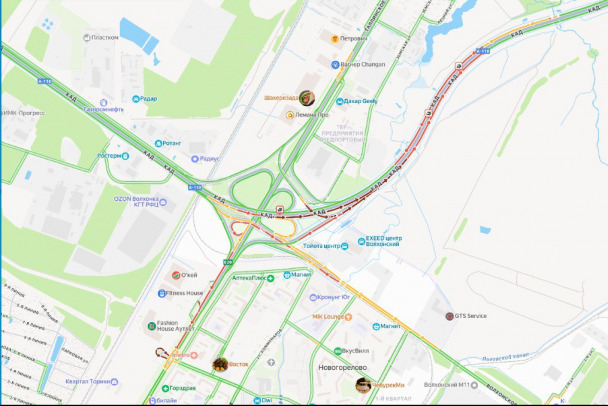 По данным сервиса "Яндекс Карты", днем 23 января серьезно затруднено движение на КАД у Новогорелово. На внешнем кольце образовалась пробка на 2 километра, участок даже "побагровел". На внутреннем кольце в том же месте стоит движение на 2,3 км.