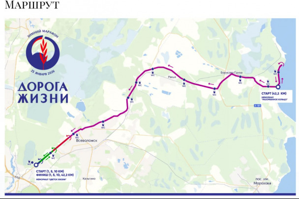Спортсмены выйдут на старт 57-го по счету марафона "Дорога Жизни" утром в предстоящее воскресенье, 25 января. Маршруты пролегают по дороге, которая была единственной магистралью, по которой в блокадный Ленинград поставляли продовольствие. Предлагается дистанция в один, пять, 10 и 42,2 километра бегом. Кроме того, можно выйти на 5-километровую дистанцию для северной ходьбы.