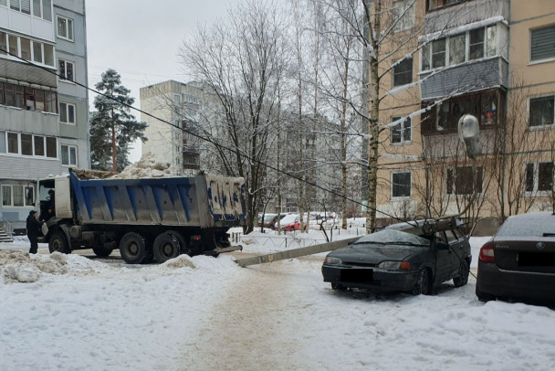 На кадрах видно, как самосвал, полный снега, сдавая задним ходом, задел столб, и тот упал прямо на стоящую поблизости машину.