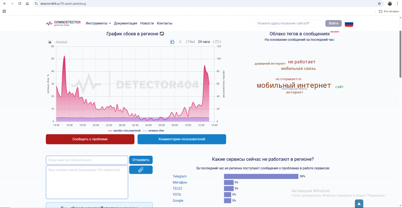 Что касается связи и интернета, то, по данным сервиса Downdetector, к 12:30 в Петербурге резко возросло количество жалоб на скорость интернета.