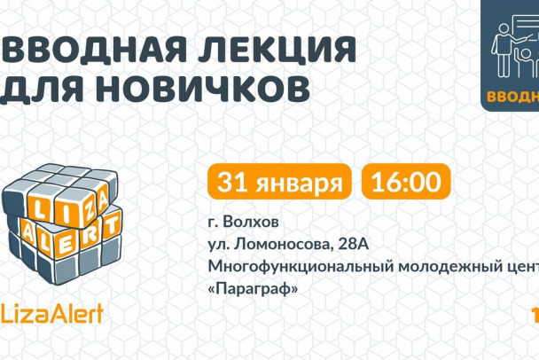 Поисковый отряд "ЛизаАлерт" 31 января проведет вводную лекцию в Волхове для желающих вступить в отряд. Мероприятие запланировано в многофункциональном молодежном центре "Параграф" на улице Ломоносова, 28А. Начало в 16:00.