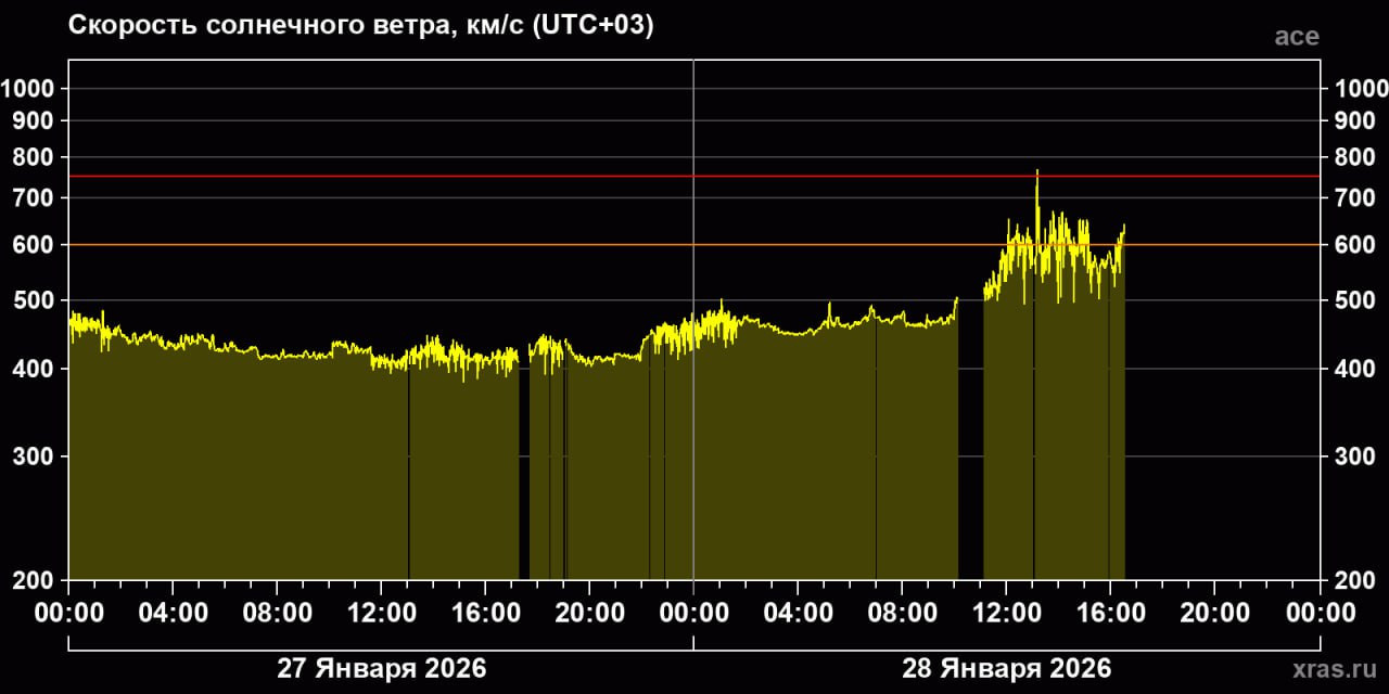 Дело в том, что сейчас к Земле подошел поток быстрого солнечного ветра из корональной дыры. Предполагается, что в ближайшее время геомагнитные индексы перейдут в желтую зону, что означает переход магнитосферы в состояние возбуждения.