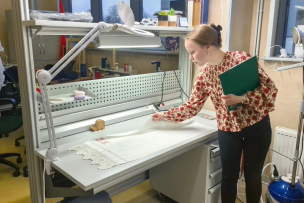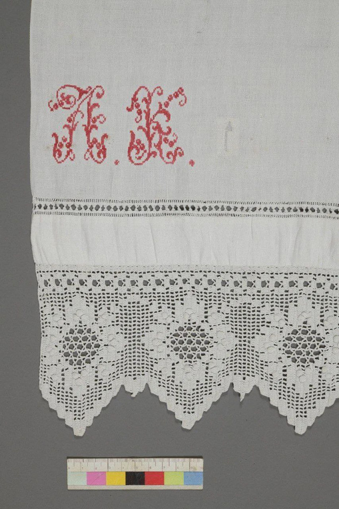 Специалист Международного центра реставрации Варвара Лангинен очистила ткань от загрязнений, укрепила ее и восстановила утраченные фрагменты мережки и кружева. На полотенце сохранились вышитые инициалы "П. К.", по которым определяли владельца. Памятник народного искусства вернули в экспозицию Староладожского музея-заповедника.