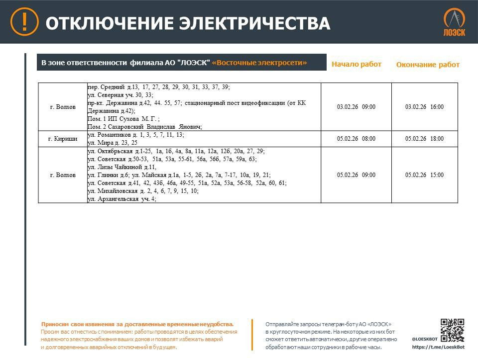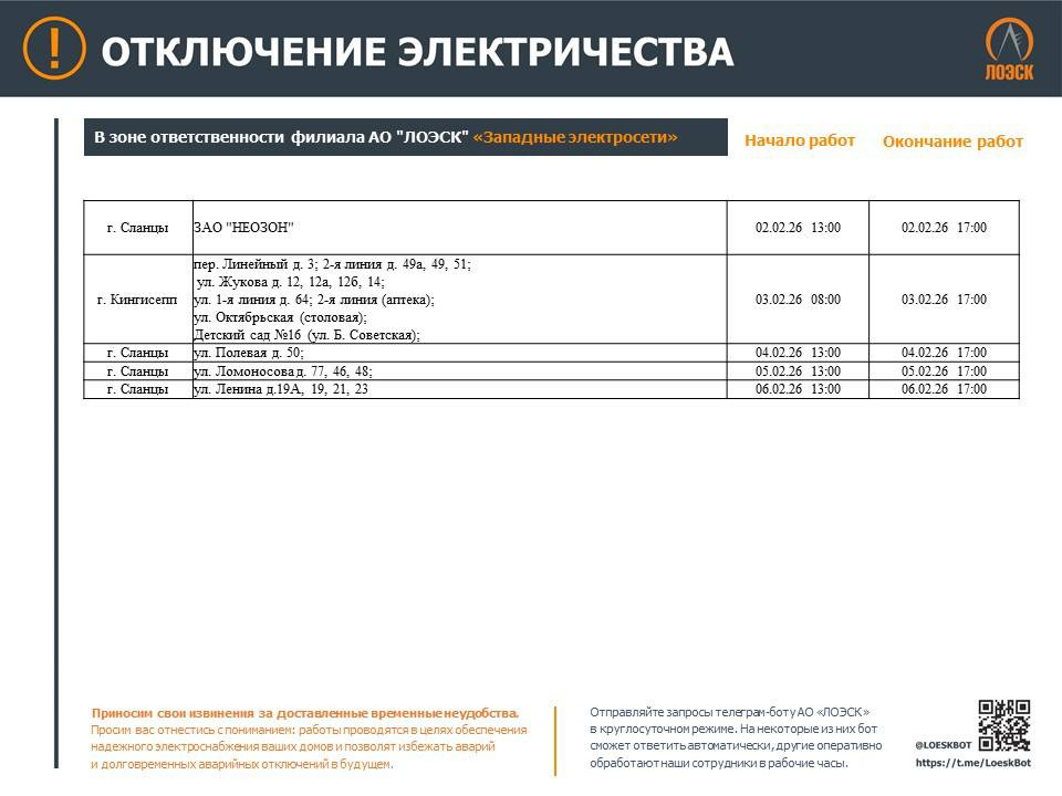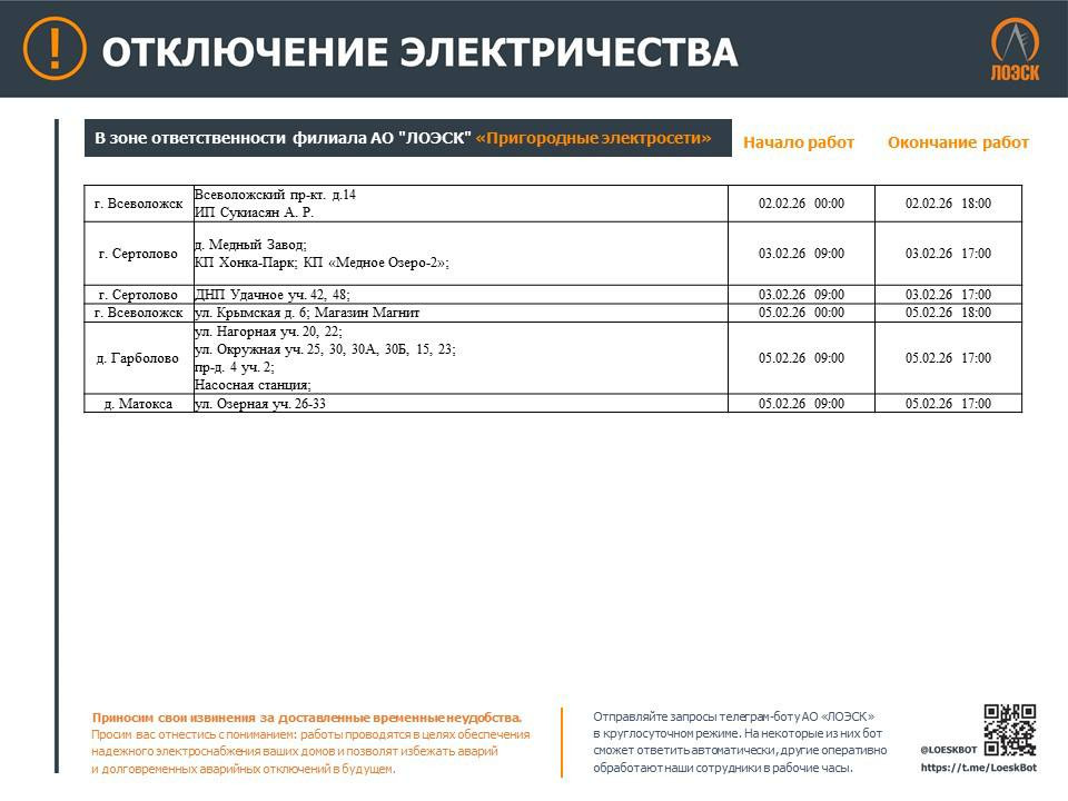 Работы 3 и 5 февраля затронут Волхов, 5 февраля — Кириши, 2 и 5 февраля — Всеволожск, 3 февраля — Сертолово, 2, 4, 5 и 6 февраля — Сланцы, 3 февраля — Кингисепп, 4 февраля — Лугу, 3, 4, 6 февраля — Кировск, 5 февраля — Шлиссельбург. Также 5 февраля без ресурса могут остаться деревни Матокса и Гарболово.