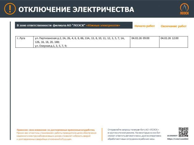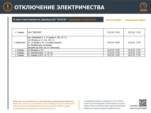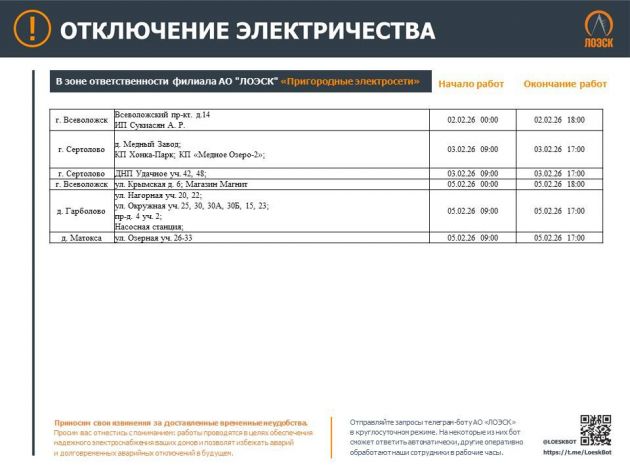 Как сообщает пресс-служба АО "ЛОЭСК" 31 января, готов график плановых отключений света с Ленобласти на следующую неделю — со 2 по 8 февраля.