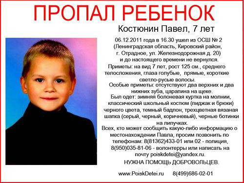 Паша Костюнин — нераскрытая тайна Ленобласти. Мальчик до сих пор числится без вести пропавшим. Об этом деле много писало наше издание. За годы поисков Паши перевернули все, что можно перевернуть, но ничего. За возможное убийство сидел невиновный, оговаривал себя упырь. А начальная точка — 2 декабря 2011 года, посёлок Отрадное Кировского района Ленобласти. В 17 часов первоклассник Паша Костюнин взял портфель с рисунком из мультфильма "Танчики" вышел из школы №2 на улице Железнодорожная, позвонил маме, что идёт домой. В 17:50 его мобильный прекратил работать. С этого момента местонахождение ребёнка неизвестно.