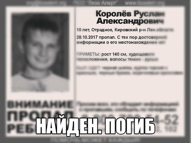 28 октября 2017 года в Отрадном пропал ещё один школьник - 10-летний Руслан Королёв. Он сел на электричку, которая идет от станции Пелла до Ивановской. Ребёнка искали почти два месяца. Полицейские побывали практически во всех квартирах жителей Отрадного. В поисках были задействованы мощности специальных служб ГУ МВД и регионального ФСБ.