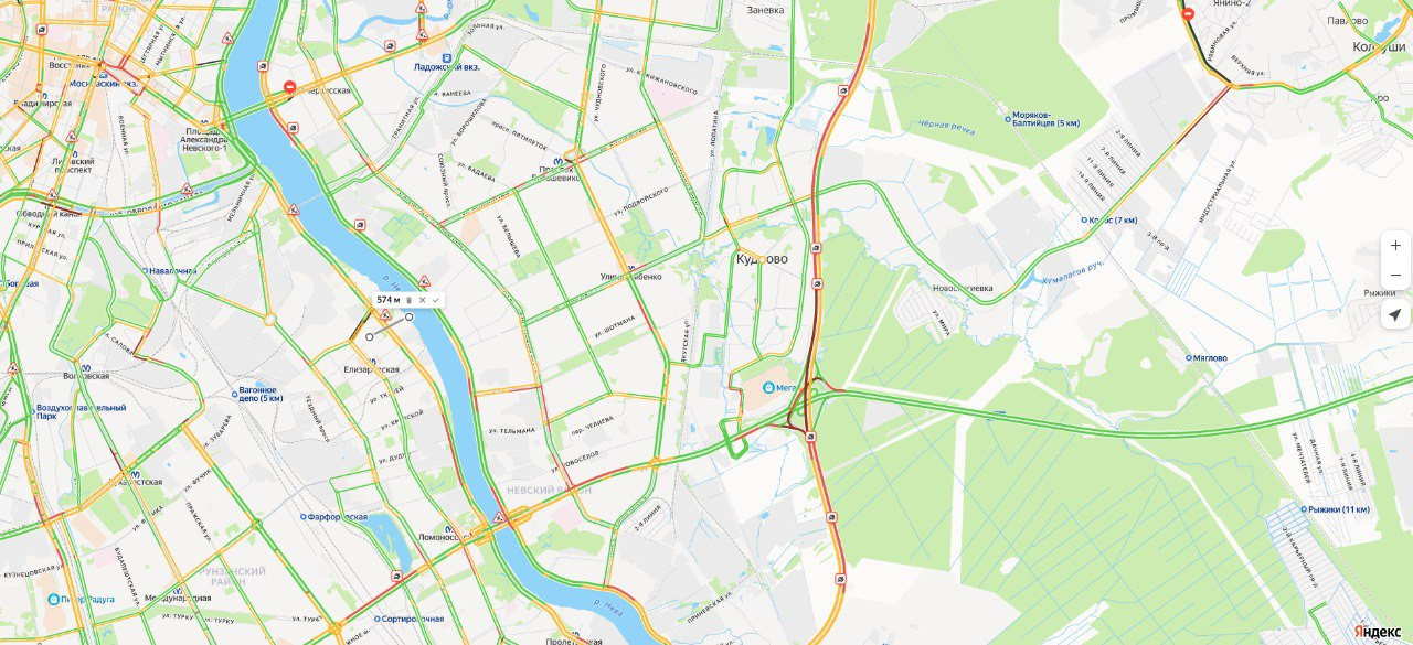 Участок кольцевой находится в районе Мурманского шоссе. На внутреннем кольце образовались многокилометровые пробки. "Багрово-красный" участок фиксируется на протяжении 5,5 км.