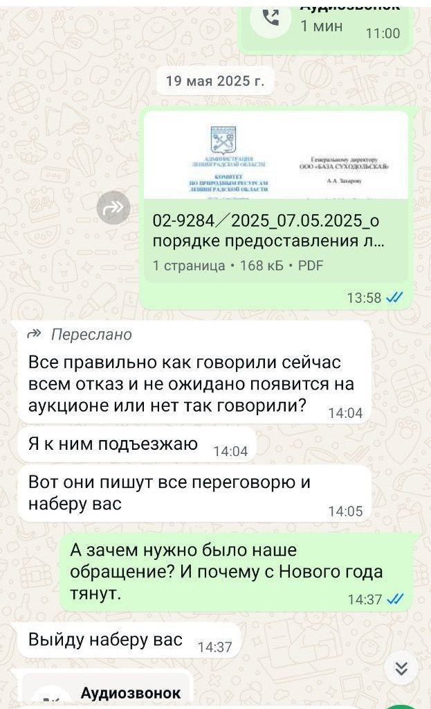 В официальной повестке между Александром и Рослесинфоргом тоже был заключен договор на разработку проектной документации лесного участка, это стоило 88 тысяч рублей (подтверждающие документы есть у 47news). В итоге 27 декабря 2024-го надел был поставлен на кадастровый учет, Александр стал ждать аукциона, его якобы обещали после нового года.