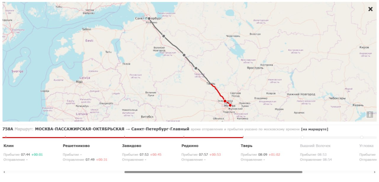 Как следует из данных на сайте РЖД, у поезда №756 задержки начались еще на этапе прибытия в Тверь. До станции "Бологое-Московское" состав пока не доехал, хотя по расписанию должен был быть там в 08:56. Поезд №758 начал отставать после станции "Решетниково".