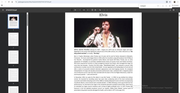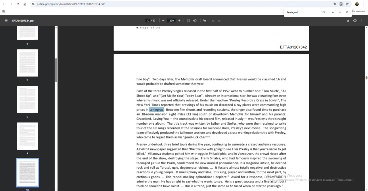 При поиске Leningrad в эпштейновских архивах выпадают пять файлов, и только два актуальны для современности. Парадоксально, но можно найти два упоминания Ленинграда в идентичных перепечатках статьи The New York Times об Элвисе Пресли. Там пишут, что его пластинки были запрещены в советское время. В другой статье рассказывают о судьбе Владимира Путина – "его воспитали суровые ленинградские улицы".