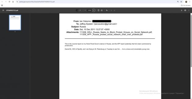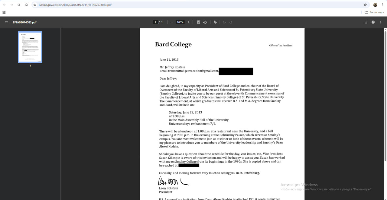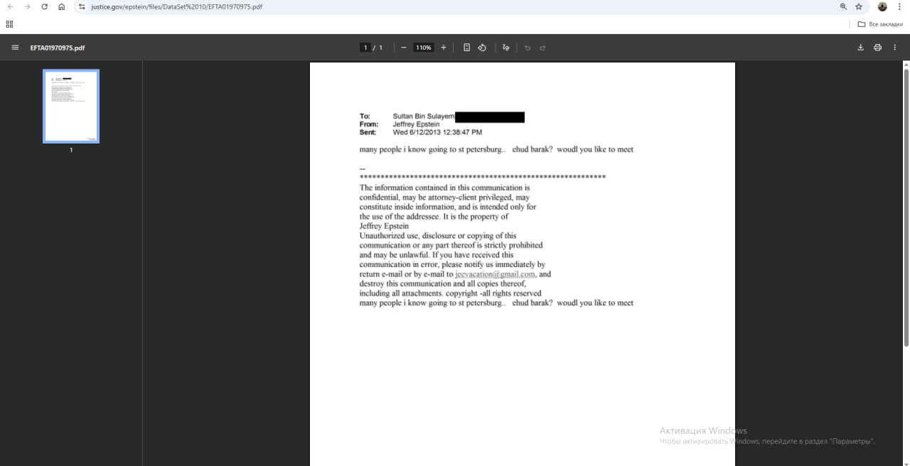 Интересно, что в 2013 году он получил официальное приглашение посетить Смольный институт в Петербурге. Зимой того же года Эпштейн пишет Султану Ахмеду бин Сулайему, бизнесмену из ОАЭ (главному исполнительному директору DP World): "Много людей собираются посетить Петербург… Эхуд Барак? (бывший премьер-министр Израиля)... Хочешь встретиться?". Двумя годами ранее виделся и с Павлом Дуровым. "Храбрый молодой человек". Вместе с ним приезжал Даниэль Эк, основатель музыкального сервиса Spotify.