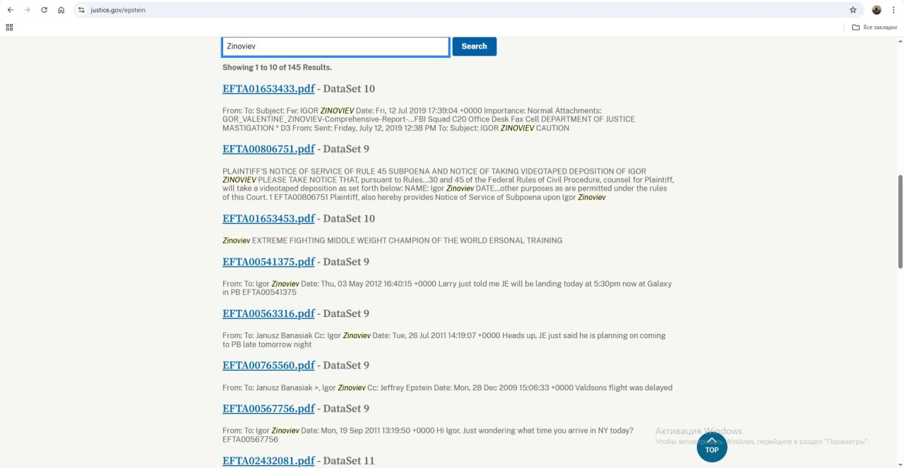 Когда его спортивная карьера подошла к концу, он вошел в круг Эпштейна. СМИ пишут, что финансиста от развращения детей он отговаривал. В файлах Igor Zinoviev упоминается 125 раз. А просто Zinoviev – 145 раз.