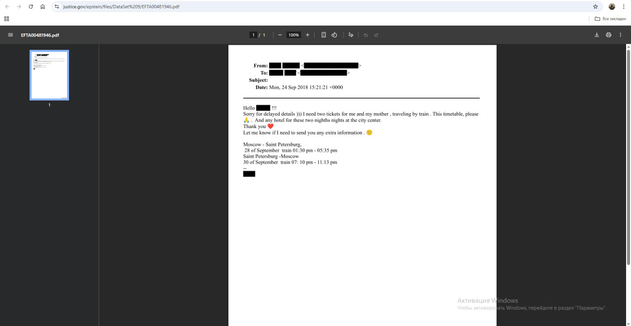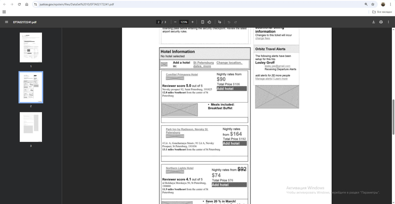Просмотреть все 1 523 файла по запросу St. Petersburg (Санкт-Петербург) – дело не быстрое. Но 47news обратил внимание, что большая часть писем, которые получал или сохранял Эпштейн, связаны с перелетами. Там бронирование как авиабилетов, так и отелей. Например, личный ассистент Лесли Грофф пишет, что ей пришлось заново оформлять визу Эпштейна. Указывается, что он будет останавливаться на Невском, Гончарной и Большой Морской.